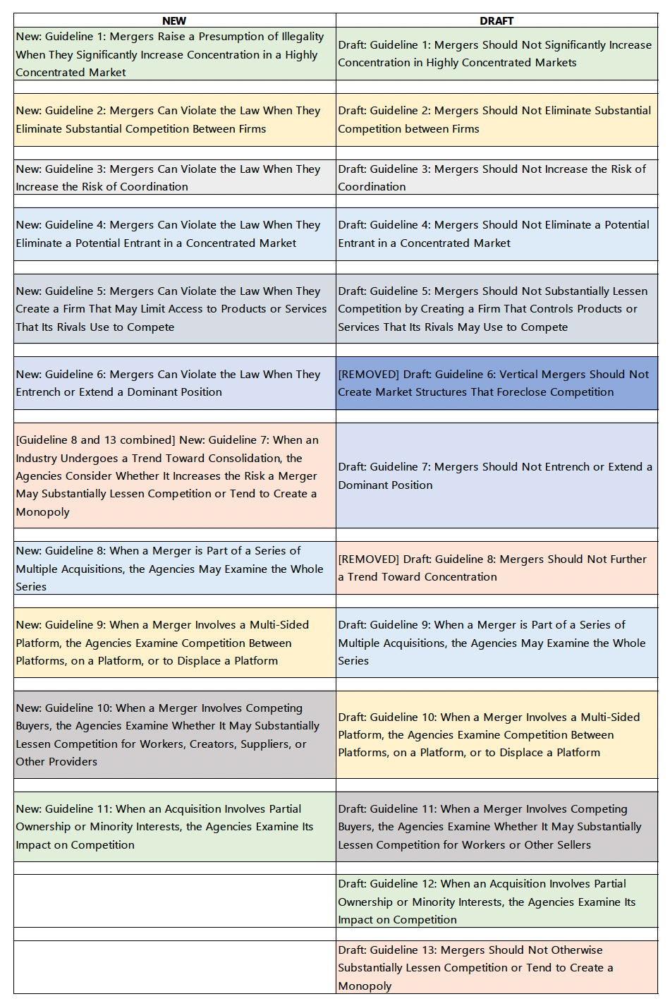 I put together a quick comparison chart of the new 2023 Merger Guidelines with the Draft Guidelines from July 2023. It appears that vertical merger draft guideline 6 was removed, and draft guidelines 8 and 13 were combined into Guideline 7.